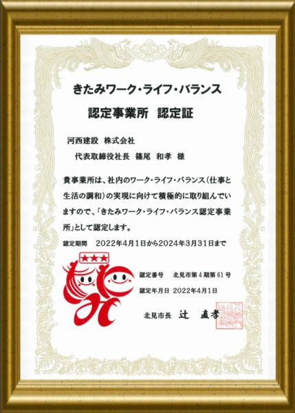 きたみワーク・ライフ・バランス認定事業所 2022.04.13 2022/4/1から2024/3/31までの期間、男性も女性も性別にかかわりなく、仕事と家庭生活 (子育て・介護・地域活動・自己啓発など)の両立支援や、 男女が共にいきいきと働きやすい職場環境づくりなどに積極的に取り組んでいる企業として、 北見市より、第3ステージ★★★の『きたみワーク・ライフ・バランス認定事業所』として 継続認定を受けました。