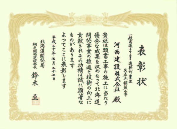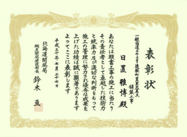 平成30年度 北海道開発局優良工事表彰(網走開発建設部長表彰) 2018.07.27 北海道開発局網走開発建設部発注の『一般国道242号 遠軽町 豊里交差点舗装工事』において、 北海道開発局網走開発建設部長より、当社及び現場代理人(日置雅博)へ 北海道開発局優良工事表彰(網走開発建設部長表彰)を頂きました。